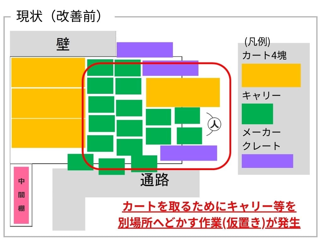 01 | 現状の把握 什器を置き場から取り出す際に不要な什器をどかす作業(仮置き) |