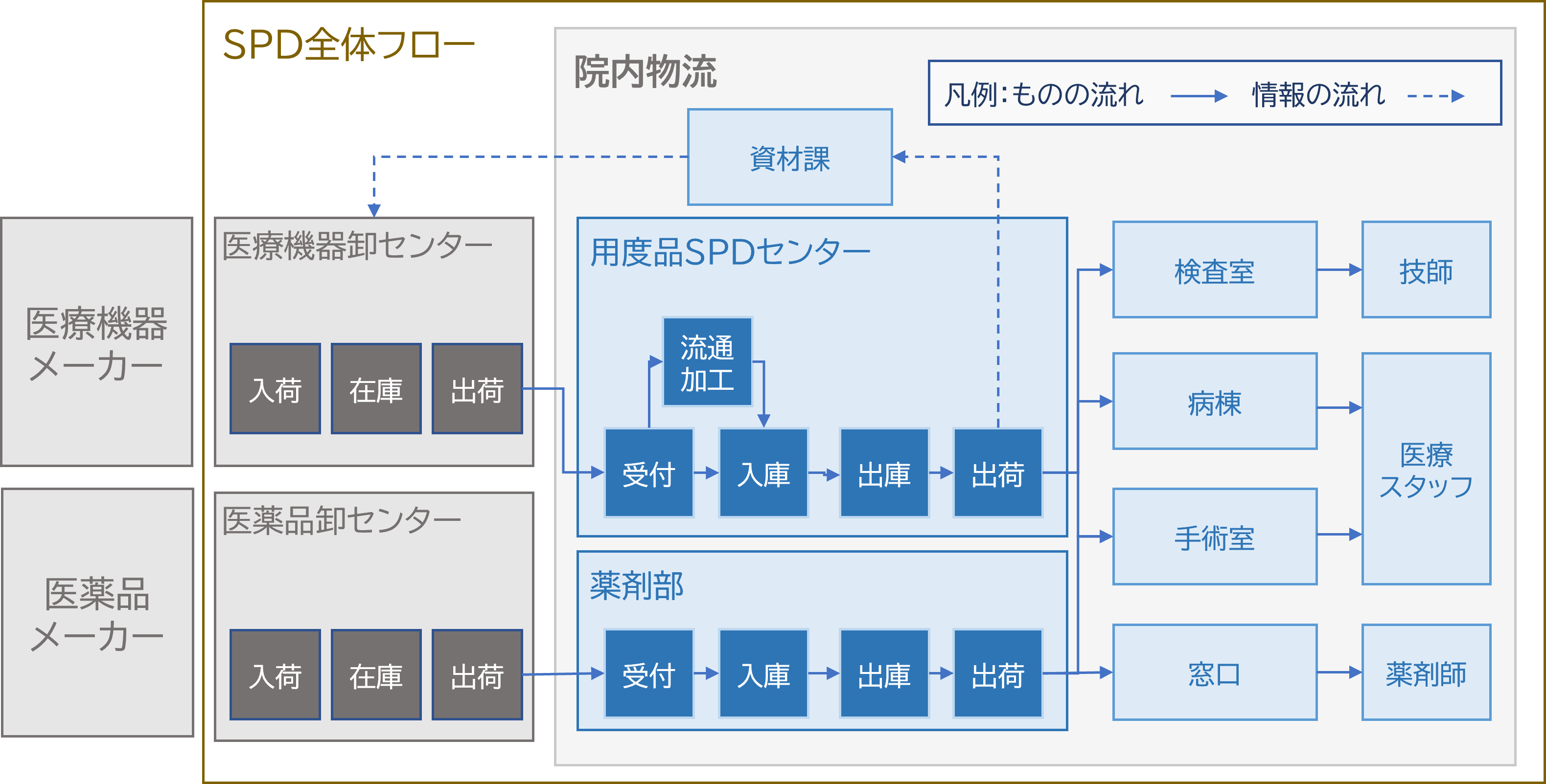 医薬・医療機器卸から病院までのサプライチェーンを指すSPDは、物品が「必要なときに必要な量が、必要な場所へ届くまでの仕組み」であり、これは、病院の円滑な業務にとっての「血液」のような重要な役割を果たしています。それは病院における主要な機能であり、院外からの入荷、検品、在庫保管、そして病棟や手術室への補充まで、一連の流れを専門的に管理します。