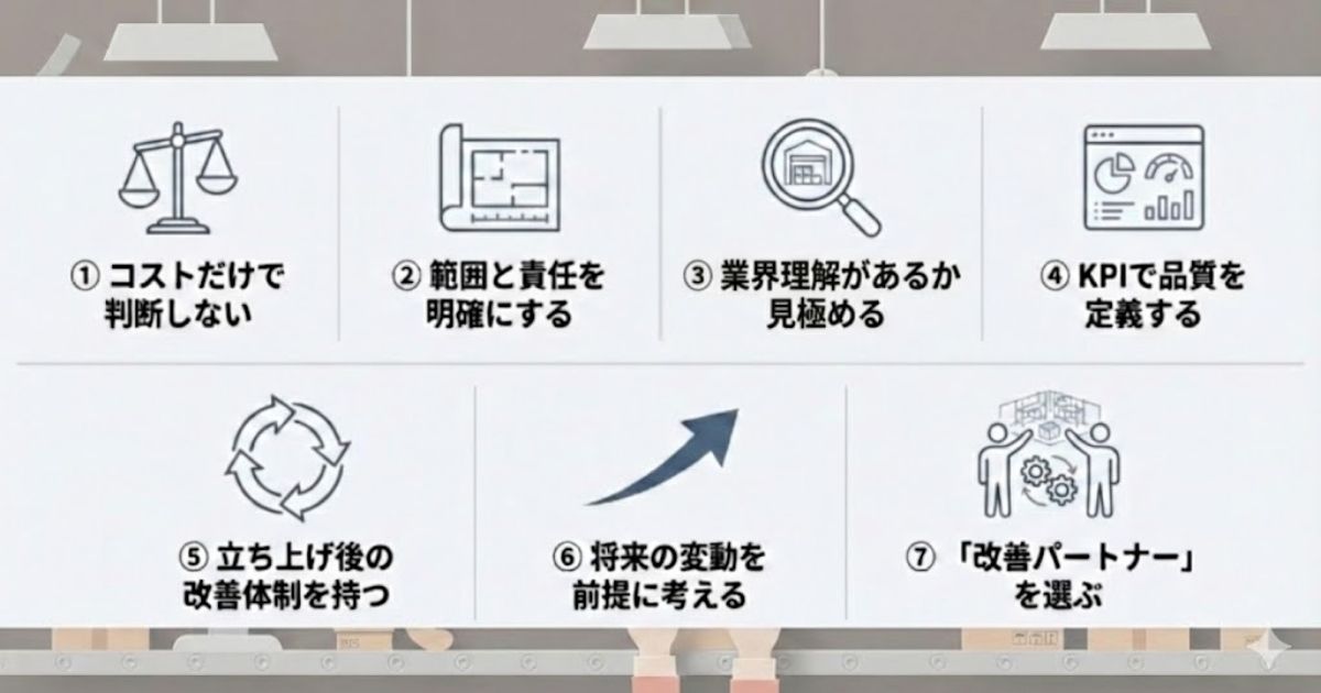 コストだけで判断しない 委託範囲と責任範囲を明確にする 現場理解に基づいた設計を行う KPIと改善体制を持つ 将来変化を前提に考える