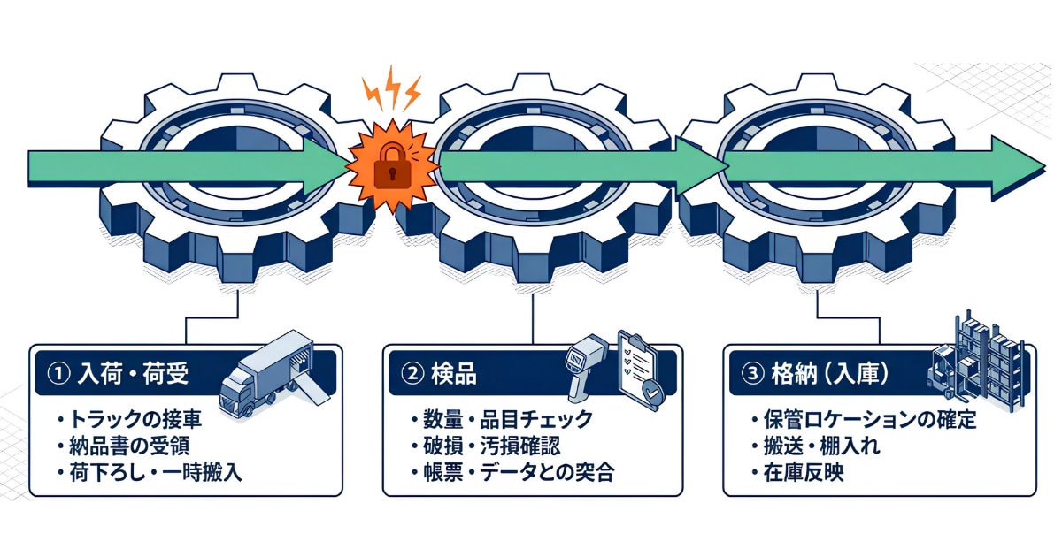 物流倉庫における入荷作業は、一般的に以下の3工程で構成されています。