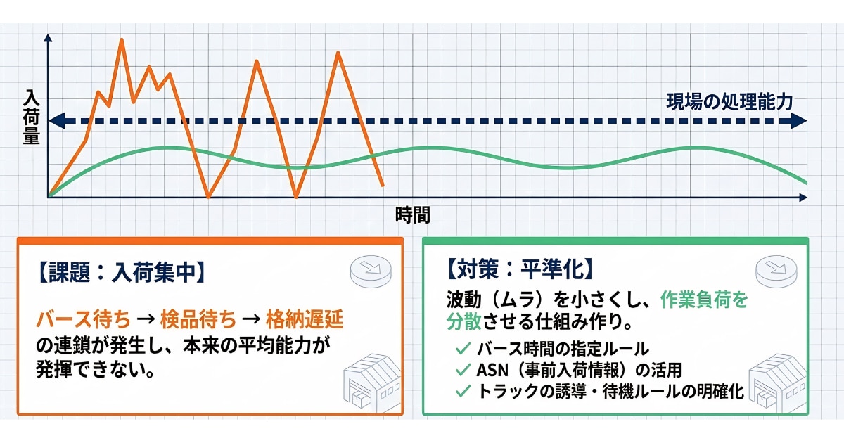 物流の流れを安定して運営するためには、入出荷や作業量の波動(ムラ)を小さくすることが重要です。