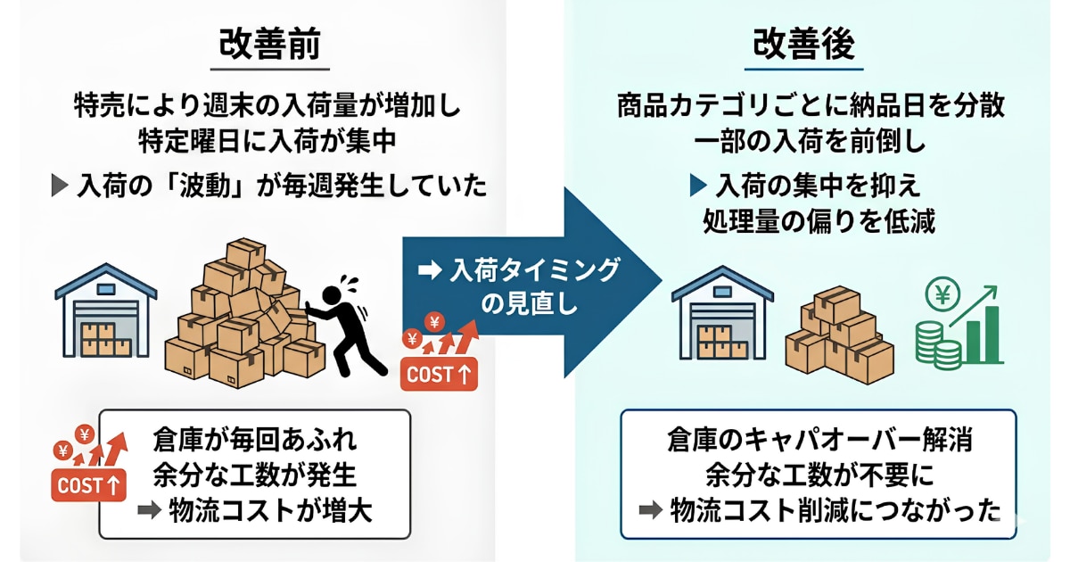 といった波動の実態を整理し、入荷の平準化から着手することをおすすめします。