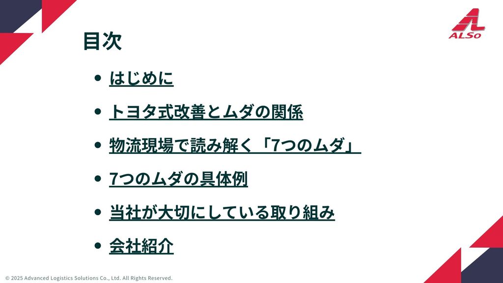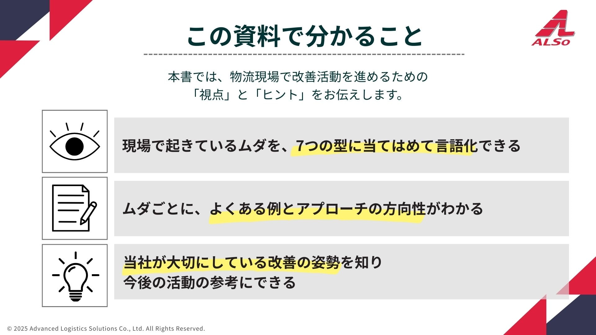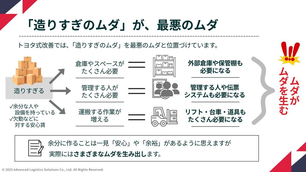 物流現場のムダを7つの視点で整理し、再現性のある改善につなげるための実践資料です。