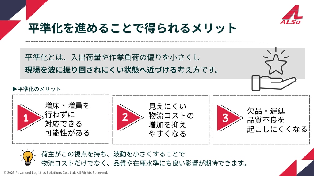 増床・増員の前に検討すべき物流センターの「平準化」を解説した資料です。